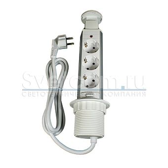 Блок розеток выдвижной круг. d60мм, 16А, 3 поста, 2USB, серебр., провод 1,8м с вилкой