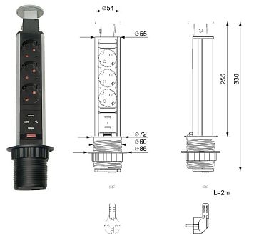 Блок розеток выдвижной круг. d60мм, 16А, 3 поста, 2USB, черн., провод 1,8м с вилкой