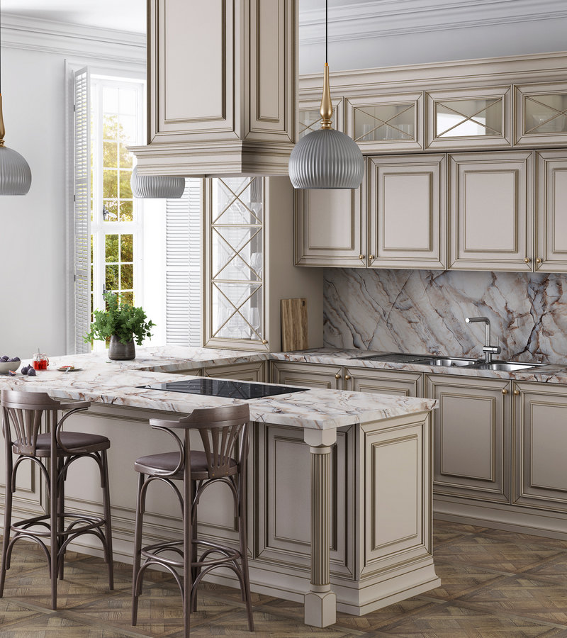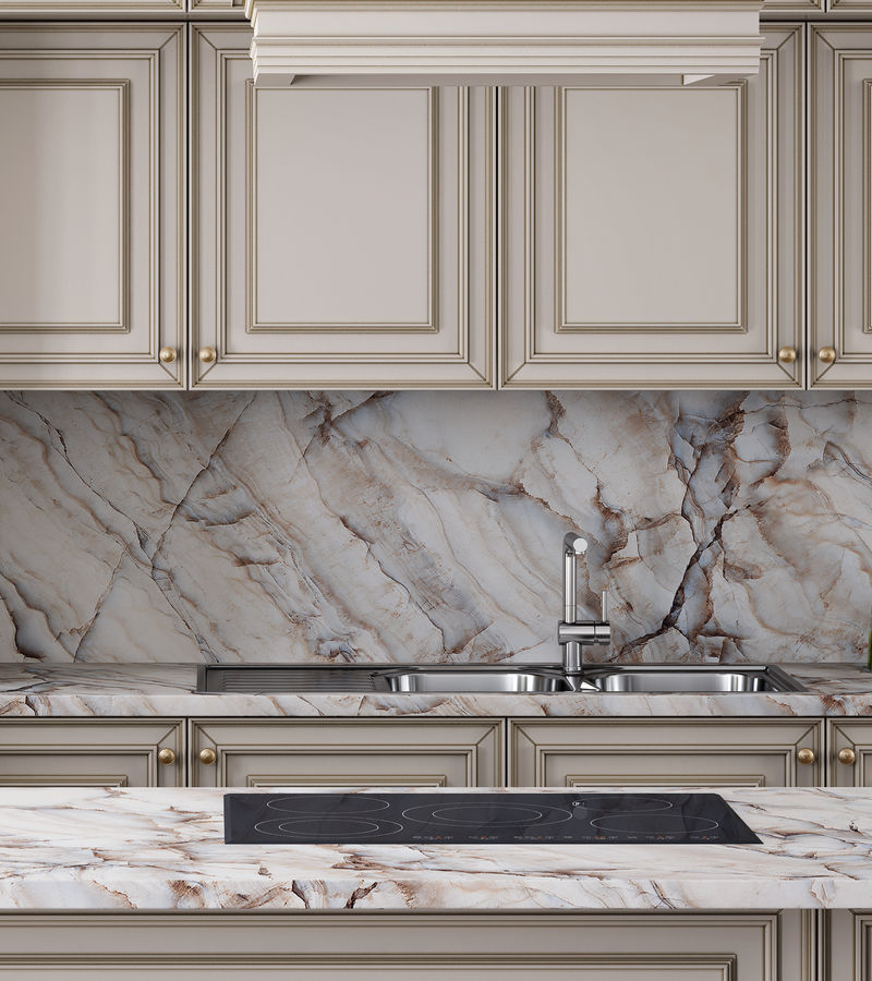 Теплые бежевые оттенки мрамора всегда востребованы в кухонных столешницах, создавая творческий настрой.